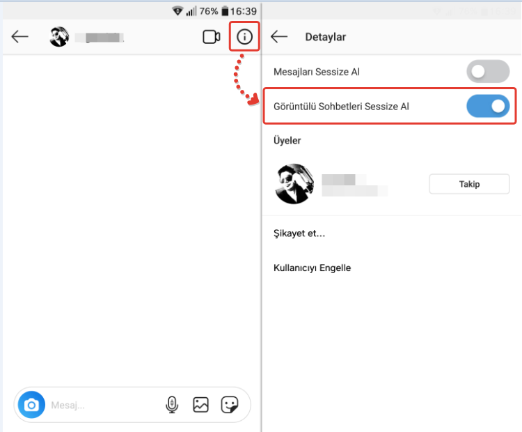 Eğer takipçilerden veya takip ettiklerinizden birinden rahatsız olduysanız sadece ona özel olarak Görüntülü Arama özelliğini kapatabilirsiniz. Bunun için mesaj gönderme ekranında iken sağ üstteki ünlem simgesine klikleyin ve gelen pencerede “Görüntülü Sohbetleri Sessize Al” seçeneğini seçin. İşlemlerimiz bu kadar.