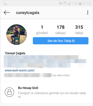 Gizli bir hesapta kişiler profilinize baktığında aşağıdaki gibi  “Bu Hesap Gizli Fotoğraflarını ve videolarını görmek için kendisini takip et.” uyarısı görünecektir.
