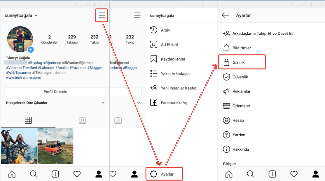 Herkese Merhaba. Bu yazımızda -basit bir şekilde- “İnstagram Hesap Gizleme Nasıl Yapılır?” Sorusuna cevap vermeye çalışacağız. İnstagram’da ilk hesap açtığınızda paylaştığınız tüm gönderiler varsayılan olarak herkese açık hale gelir. Yani herkes profilinizde paylaştığınız fotoğrafları ve videoları görebilir. Hesabınız gizledikten sonra paylaştığınız video veya fotoğrafları onayladığınız takipçiler ile sizi takip eden takipçileriniz görebilir. Hesabınızı gizlediğiniz de mevcut takipçiler bu durumdan etkilenmez. Hesap gizleme sonrasında sadece profiliniz ve bio’nuz görünmeye devam edecektir. Ancak yukarıda belirttiğim üzere video ve fotoğraflar sadece onayladığınız ve hali hazırda bulunun takipçileriniz görecektir.