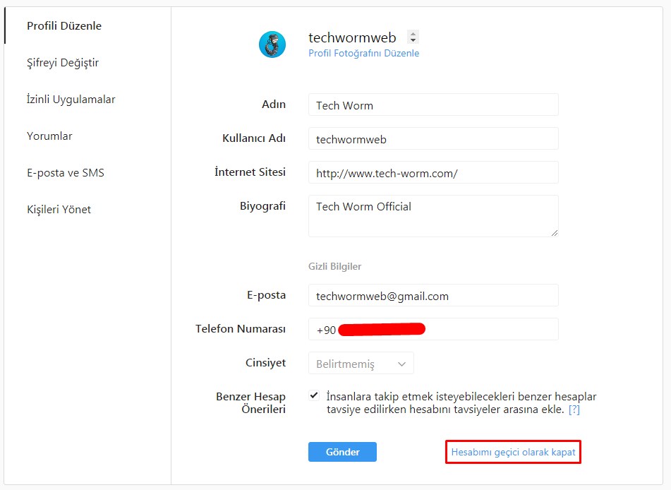 Profili düzenle kısmından en altta “Hesabı geçici olarak kapat” diyoruz.