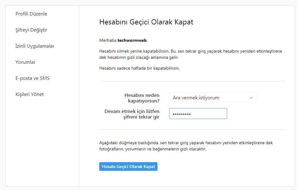 Buradaki link ben daha sonra pişman olup hesabımı kullanamaya devam edebilirim diyenler için. Hesabınızı geçici olarak kapattığınızda profiliniz, fotoğraflarınız, yorumlarınız ve beğenmeleriniz, tekrar giriş yaparak hesabınızı yeniden etkinleştirene kadar gizlenir.