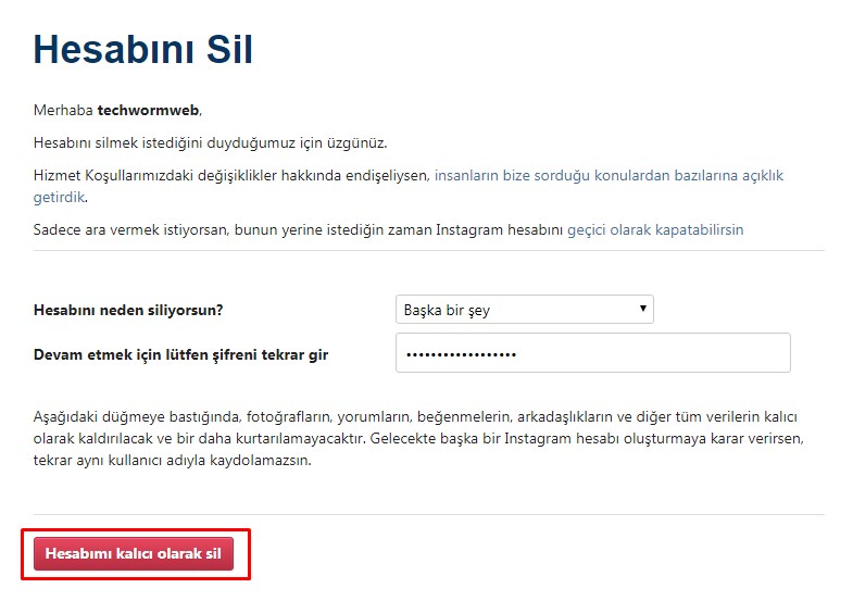 Buradaki link ben daha sonra kesinlikle bu instagram hesabını kullanmayacağım ve tamamen silmek istiyorum diyenler için. Hesabınızı sildiğinizde, profiliniz, fotoğraflarınız, videolarınız, yorumlarınız, beğenileriniz ve takipçileriniz kalıcı olarak silinir.
