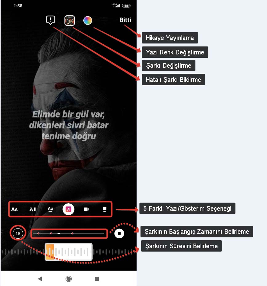 Şimdi bazı detaylar hakkında kısaca bilgi vereyim. İlk olarak hikayemiz 5 farklı seçenek ile yayınlıyor. Beğendiğiniz seçeneği gösterdiğim kısımlardan tek tek seçebilirsiniz. Hikayelere şarkı ekleme süresi minimum 5, maksimum 15 saniye ile sınırlıdır. Bunu hemen altta gösterdiğim yerden seçebilirsiniz. Ayrıca yazıların renk tonlarını değiştirmek için üst kısımdaki renk seçeneklerini klikleyebilirsiniz. Son olarak çalınan müziğin farklı bir kısımdan başlamasını istiyorsanız altta gösterdiğim yerden parmağınızla ile geri hareketleri ile değiştirebilirsiniz. Ve son olarak bazı şarkıların metni hazırlanmamış olabilir. Eğer çalınan şarkıda karakter, yazı, senkronisazyon hatası varsa ünlem kısmından bildirebilirsiniz.