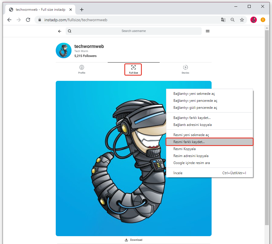Gelen sayfadan “Full Size” yazan sekmeyi seçiyoruz. Ardından karşımıza çıkan profil fotoğrafının üzerine sağ klik yapıyoruz ve karşımıza gelen pencereden “Resmi Farklı Kaydet” diyoruz. Eğer akıllı telefon kullanıyorsanız profil fotoğrafının üzerine uzunca basılı tutuyoruz ve karşımıza gelen pencereden “Resmi İndir” diyoruz.