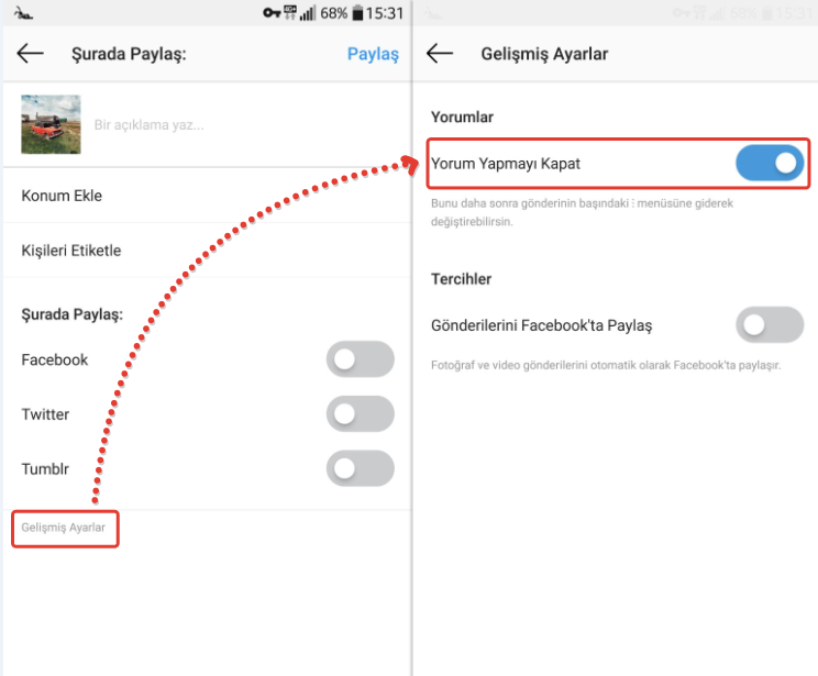 Fotoğraf veya Videoyu paylaşma sırasında paylaşım yapmadan önce gelen seçeneklerden “Gelişmiş Ayarlar” sekmesini klikliyoruz. Açılan pencereden “Yorum Yapmayı Kapat” seçeneğini aktif (mavi) hale getirdiğinizde paylaşımımız yoruma kapalı hale gelecektir. Ancak unutmayın bu işlemi yaptığınızda beğen tuşunu kaldıramıyorsunuz. Sadece yoruma kapatıyorsunuz. Ayrıca sonradan tekrar yoruma açık hale getirebilirsiniz.