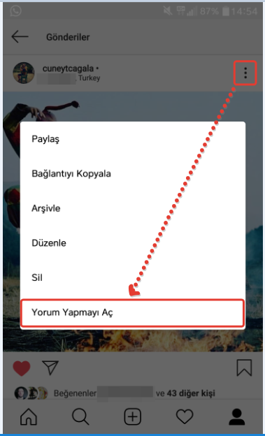 Eğer tekrar yoruma açmayı düşünüyorsanız bu kez tekrar fotoğrafı aynı şekilde klikleyin ve sağ üst kısımda bulunan dikey üç nokta simgesine klikleyin. Açılan pencerede “Yorum Yapmayı Aç” dediğinizde gönderiniz yoruma açılacak ve bundan sonra takipçileriniz yorum yapabilecektir.