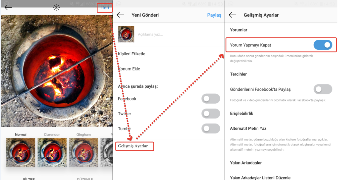 İnstagramda bir fotoğraf paylaşacaksanız paylaşım sırasında gelişmiş ayarlar sekmesinden yoruma kapatabilirsiniz. Paylaşmak istediğini fotoğrafı seçip İleri > İleri dedikten sonra karşınıza gelen “Gelişmiş Ayarlar” sekmesini klikleyerek “Yorum Yapmayı Kapatma/Açma” seçeneğine ulaşabilirsiniz. İlk kez paylaştığınızda yorum yapma açık halde gelecektir. Anahtarı sola çektiğinizde mavi şekilde simge belirecek ve yoruma kapalı hale gelecektir. Bu şekilde paylaşım yaptığınızda gönderdiniz yoruma kapatılmış olacaktır. Daha sonra tekrar yoruma kapatmak isterseniz yukarıda bahsetmiş olduğum yorum açma seçeneğini kullanabilirsiniz.