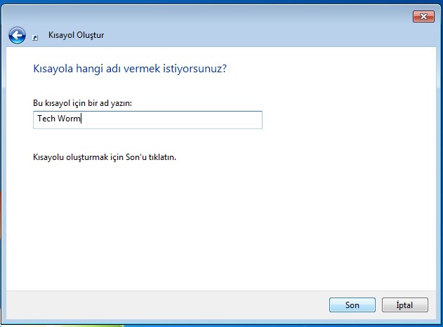 3- Bu kısayol için bir ad yazın kısmına dilediğiniz bir isim yazın. Son deyin.