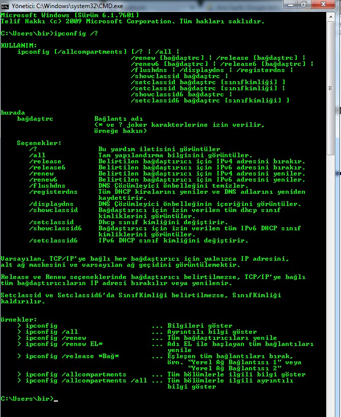 pconfig komutuyla birlikte “/?” parametresi kullanıldığında ipconfig komutunun bütün parametreleri ve kullanım şekilleri görüntülenir.