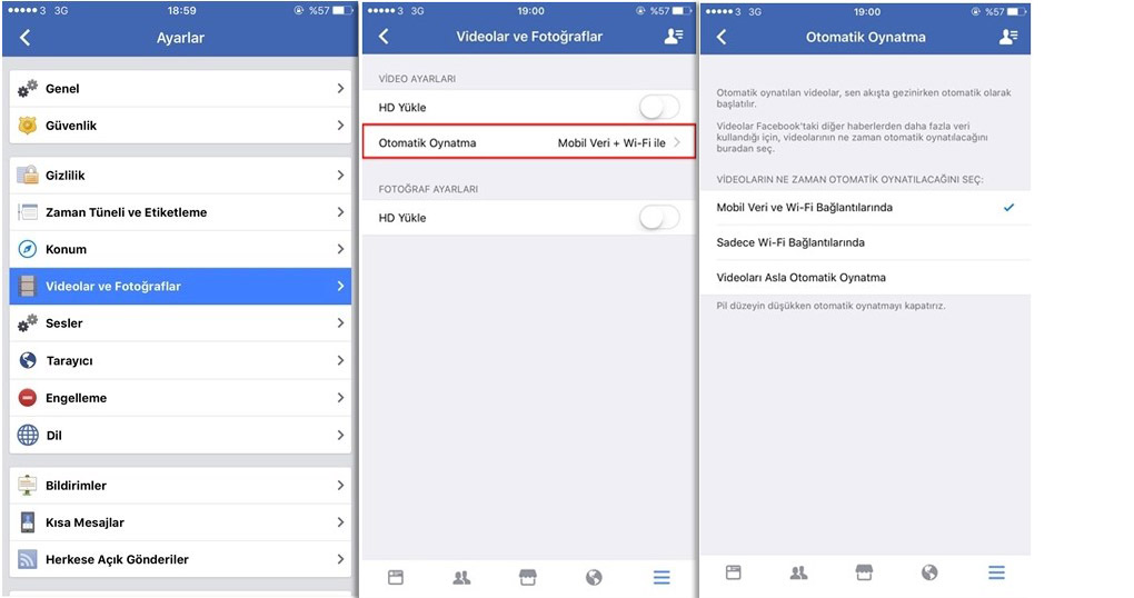 İphone yani IOS işletim sistemli Apple cihazınız için ayarlar şu şekilde yapılıyor. Yine sağdaki üç yatay çizgili butona tıklayarak Ayarlar’a gidiyoruz. Videolar ve Fotoğraflar > Otomatik Oynatma adımlarını izliyoruz. Açılan pencerede Videoları Asla Otomatik Oynatma seçeneğini seçiyoruz.