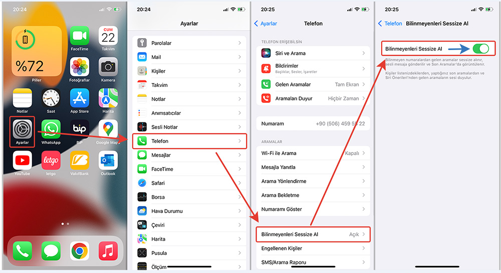 Artık bundan sonra gizli numaralardan gelen çağrılar engellenmiş olacaktır. Eğer; gizli numaradan gelen aramaları kabul etmek istiyorsanız yine yukarıdaki adımları takip ederek “Bilinmeyenleri Sessize Al” seçeneğini pasif hale getirelim.