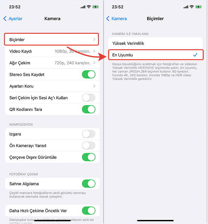 Çekimlerinizde HEIF veya HEVC biçimini kullanmanız önerilmekle birlikte bu aygıtları, diğer aygıtlar ve işletim sistemleriyle daha uyumlu olan eski biçimleri kullanarak çekim yapacak şekilde de ayarlayabilirsiniz: