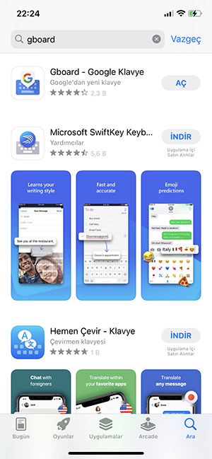 Eğer iPhone’a Google Klavyeyi eklemek istiyorsanız öncelikle AppStore‘a gidip buradan “gboard” yazarak Google Klavyeyi telefonunuza yüklemeniz gerekiyor.