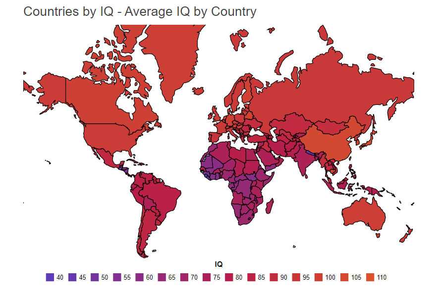 Aşağıdaki IQ haritası, ortalama IQ puanının ne kadar yüksek olduğuna bağlı olarak her ülkeyi gölgeliyor. Daha koyu bir menekşe tonu, daha düşük bir IQ puanına işaret eder. Tersine, ortalama IQ puanı daha yüksek olan ülkeler kırmızı-turuncu renkte görünür.