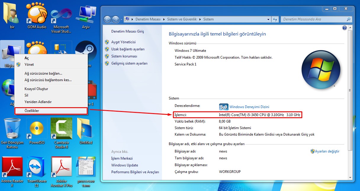 İşlemci marka/model ve özelliklerini öğrenmenin birden fazla yolu var. Dilerseniz program kullanmadan öğrenebileceğiniz gibi program kullanarak ta daha detaylı bilgi edinebilirsiniz. Genellikle bilinen yöntem masaüstünden bilgisayarım ikonuna sağ klikleyip özellikler demek burada açılan pencerede İşlemci yazan yerin karşısına bakmak. (Ancak bu bize yeterli bilgi vermiyor >>> devamını okuyun)