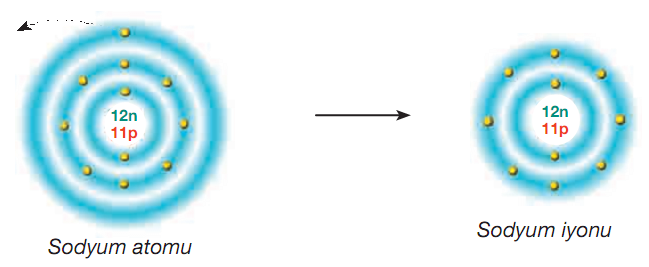 Sodyum atomu, bir elektron verdikten sonra pozitif (+) yüklü hâle gelmiştir. Pozitif (+) yüklü iyonlara Katyon denir. Katyon oluşabilmesi için atomun elektron vermesi gerekir. Katyonların elektron sayısı, proton sayısından azdır.