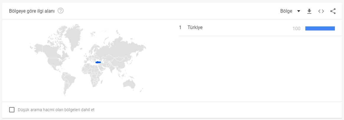 Yine ülkeler bazında kontrol ettiğimizde sadece Türkiye’de bu isimle ilgili aramaların olduğunu görüyoruz. Buda muhtemelen bizim/sizin gibi meraklı kullanıcıların aramaları sonucunda oluştuğunu söyleyebiliriz.