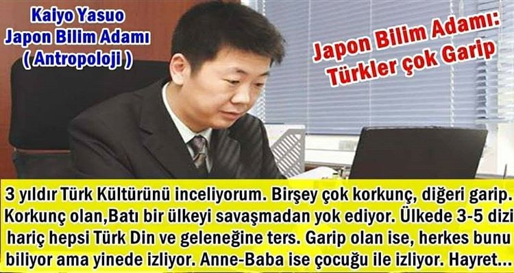 Son günlerde -özellikle sosyal medyada- birçok kişi Japon Antropolog Kalyo Yasuo’nun “Türk Dizileri” hakkında yazmış olduğu bir eleştiri yazısını paylaşıyor. Söz konusu yazıda “Üç yıldır Türk Kültürünü inceliyorum. Batı bir ülkeyi savaşmadan yok ediyor. Ülkede 3-5 dizi hariç hepsi Türk din ve geleneğine ters. Garip olan ise herkes bunu biliyor ama yine de izliyor. Anne baba ise çocuğuyla izliyor. Hayret…” deniliyor. Tabi bu yazı sosyal medyada yayılmakla kalmıyor köşe yazılarına hatta gazetelerde bile haber konusu oluyor.