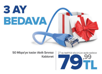 27 Ay taahhüt sözünüz ile 50 Mbps‘ye kadar Akıllı Sınırsız İnternet ayda sadece 79,99 TL.