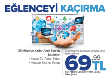 24 Ay taahhüt sözünüz ile 25 Mbps‘ye Kadar Akıllı Sınırsız İnternet, Kablo TV Temel Paket ve Vizioon Sinema Paketi ayda sadece 69,99 TL.
