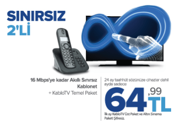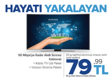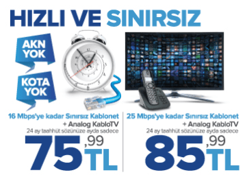 24 Ay taahhüt sözünüz ile 16 Mbps‘ye kadar Sınırsız İnternet ve Analog Kablo TV ayda sadece 75,99 TL veya 25 Mbps‘ye kadar Sınırsız İnternet ve Analog Kablo TV ayda sadece 85,99 TL.