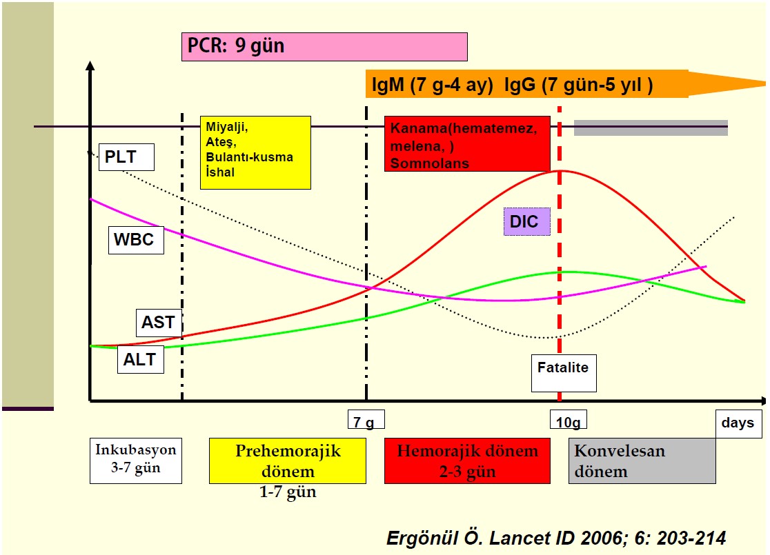 1- Virüsün bulaşması ile hastalık gelişmesi arasında geçen süre kuluçka dönemi olarak adlandırılır. Bu süre; kene ile ısırılma sonucu bulaşlarda 1-3 gün, en fazla 9 gün; enfekte kan, ifrazat veya diğer dokulara doğrudan temas sonucu olan bulaşlarda 5-6 gün, en fazla 13 gün olabilmektedir.