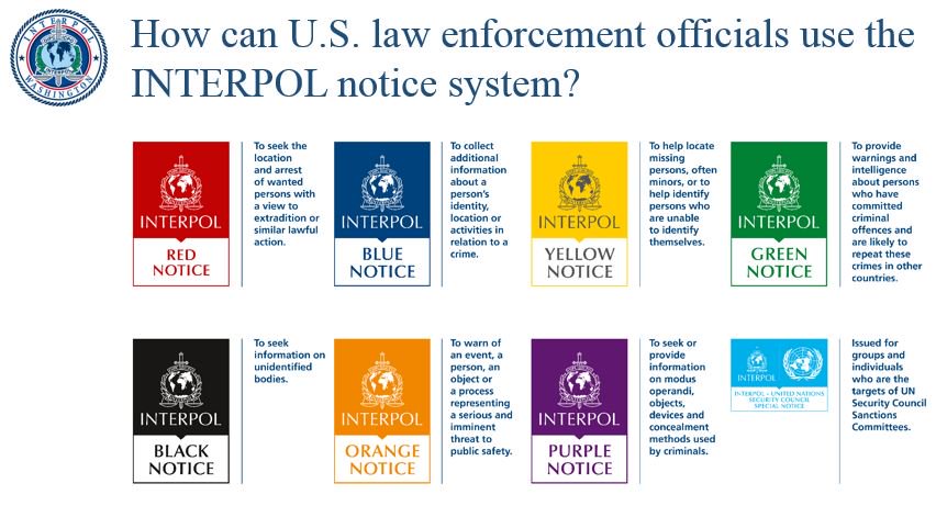 1- Kırmızı Bülten: Bir tutuklunun ya da tutuklama emri çıkartılan kimsenin görüldüğü yerde tutuklanıp, iade edilmesini belirten bültendir. Tutuklunun ya da bir ülke tarafından tutuklama emri çıkartılmış kişinin yakalandığı ülkenin kanunlarına göre suçlu sayılması halinde iadesi mümkündür, aksi halde sadece takibe alınır.