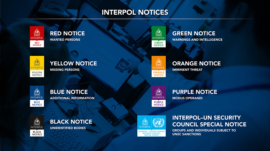 1- Kırmızı Bülten: Bir tutuklunun ya da tutuklama emri çıkartılan kimsenin görüldüğü yerde tutuklanıp, iade edilmesini belirten bültendir. Tutuklunun ya da bir ülke tarafından tutuklama emri çıkartılmış kişinin yakalandığı ülkenin kanunlarına göre suçlu sayılması halinde iadesi mümkündür, aksi halde sadece takibe alınır.