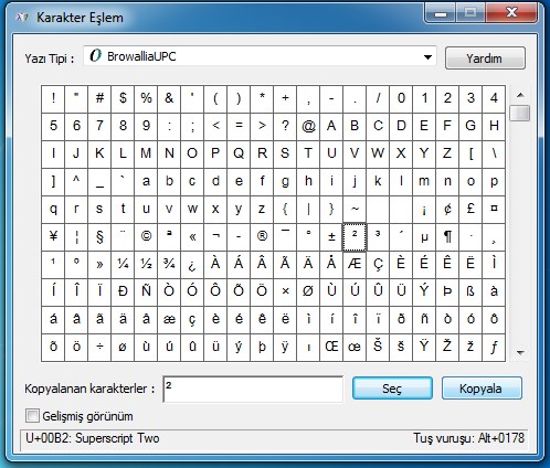 Karşınıza Karakter Eşlem kütüphanesi gelecektir. Buradan dilediğiniz üslü veya diğer karakterleri seçip kopyala diyelim ve istediğiniz yere yapıştırın.