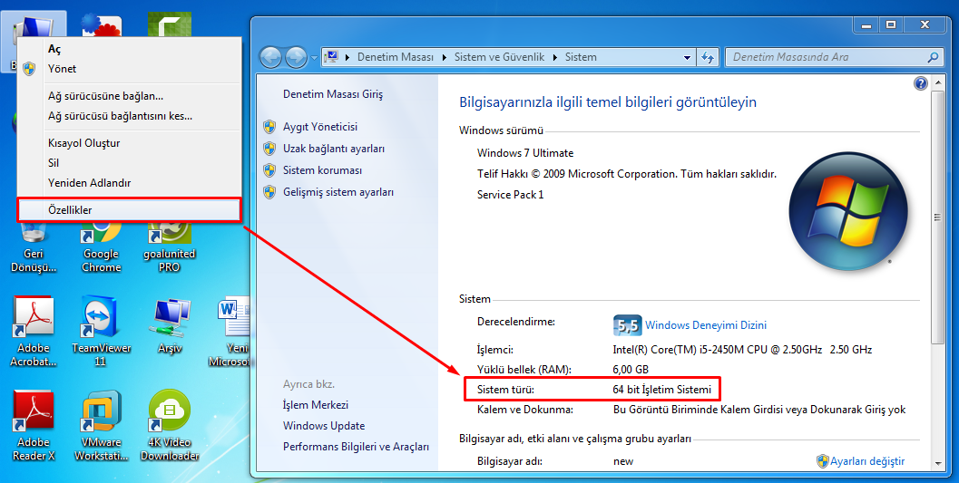 Bilgisayarım kaç bit diyenler için masaüstünden Bilgisayarım simgesine dağ klikleyip Özellikler dedikten sonra açılan pencerede Sistem Türü yazan yerin karşısındaki 32 veya 64 Bit işletim sistemi olup olmadığını öğrenebilirler.