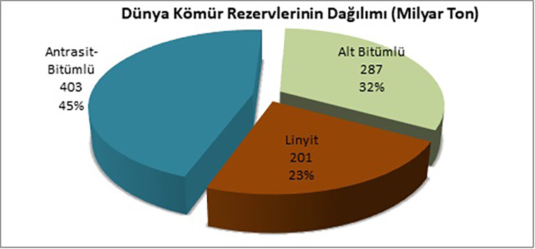 Dünyada türlerine göre kömürün kaynak dağılımına baktığımızda %45 ile bitümlü kömür ve antrasit en fazla orana ulaşmakta olup bunu %32 ile alt bitümlü kömürler ve %23 ile linyitler takip etmektedir (Şekil 4).