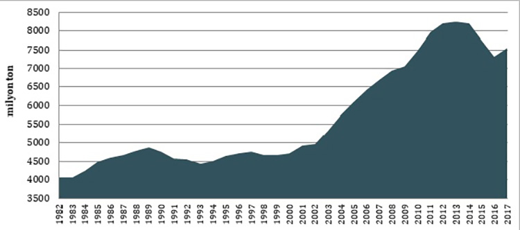 1998 yılından 2013 yılına kadar, yani 14 yıl boyunca kesintisiz artan küresel kömür üretimi 2016 yılında bir önceki yıla göre %5,3 oranında azalarak 7.324 milyon ton düzeyine gerilemiş, 2017 yılında ise %3,26 oranında artarak 7.563 milyon ton düzeyine yükselmiştir (IEA, 2019) (s.4). 2000-2014 yılları arasındaki üretim artış oranı %73 düzeyindedir.