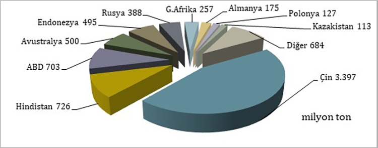 2017 yılında dünya kömür üretiminin %45’ini (3.397,2 milyon ton) tek başına Çin gerçekleştirmiştir. İkinciliği ABD’den devralan Hindistan’ın payı %10 (725,5 milyon ton); ABD’nin payı %9 (702,7 milyon ton) ve Avustralya’nın payı ise %7 (499,5 milyon ton) oranındadır.