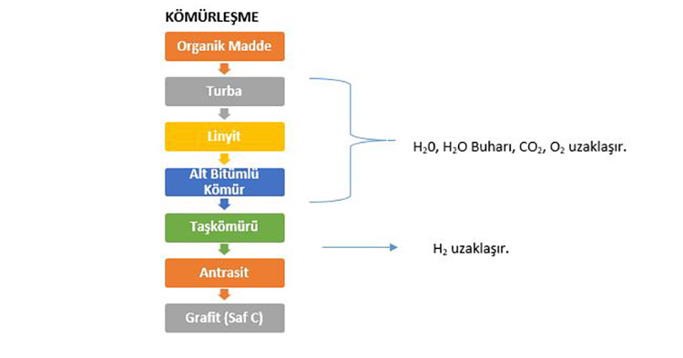 Kömürün oluşum süreci kısaca şu şekilde özetlenebilir: Bitki topluluklarının birikimi ve çökelmesi şeklinde birinci faz, biyokimyasal ve jeokimyasal bozulmaların olduğu ikinci faz ve termokimyasal dönüşümlerle fiziksel, petrografik ve kimyasal özelliklerin oluştuğu üçüncü faz (Şekil 1).