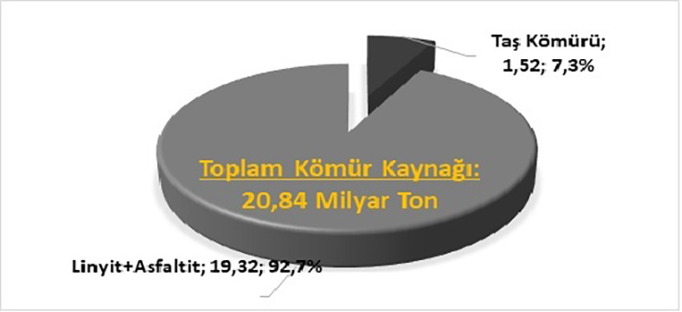 Ülkemiz kömür kaynaklarının henüz üçte birinin etüt ve fizibilite çalışmaları tamamlandığı için çok az bir kısmı rezerv olarak nitelendirilmektedir. Son yıllarda yürütülen arama ve rezerv geliştirme çalışmaları sonucunda ciddi bir kömür kaynağı artışı sağlanmıştır. Türkiye’de toplam kömür kaynağı yaklaşık olarak 20,84 milyar tondur (MTA, 2020; TKİ 2020) (Şekil 7).