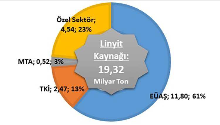 Toplam 20,84 milyar ton kömür kaynağımızın yaklaşık olarak 19,32 milyar tonu linyittir. Bunların sektörel dağılımı Şekil 8’ de verilmektedir.