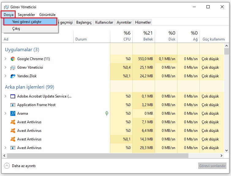 Böylece karşımıza “Görev Yöneticisi” penceresi gelecektir. Burada Dosya | Yeni Görevi Çalıştır sekmesini seçiyoruz.