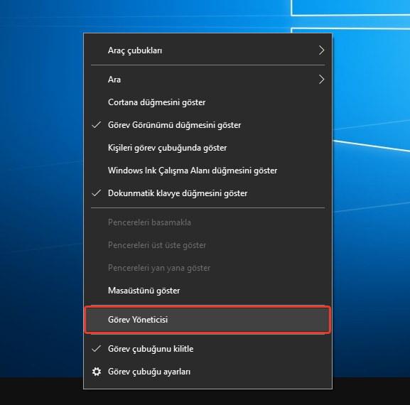 İşlemimizde ilk önce komut istemini yönetici olarak açmak gerekiyor. Bunun için görev çubuğunun üzerinde sağ tıklıyoruz. Gelen panelde “Görev Yöneticisi” sekmesini seçiyoruz.