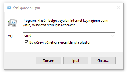 Açılan pencereye “cmd” şeklinde yazdıktan sonra “Bu görevi yönetici ayrıcalıklarıyla oluştur” seçeneğini onaylı hale getirip tamam diyoruz.
