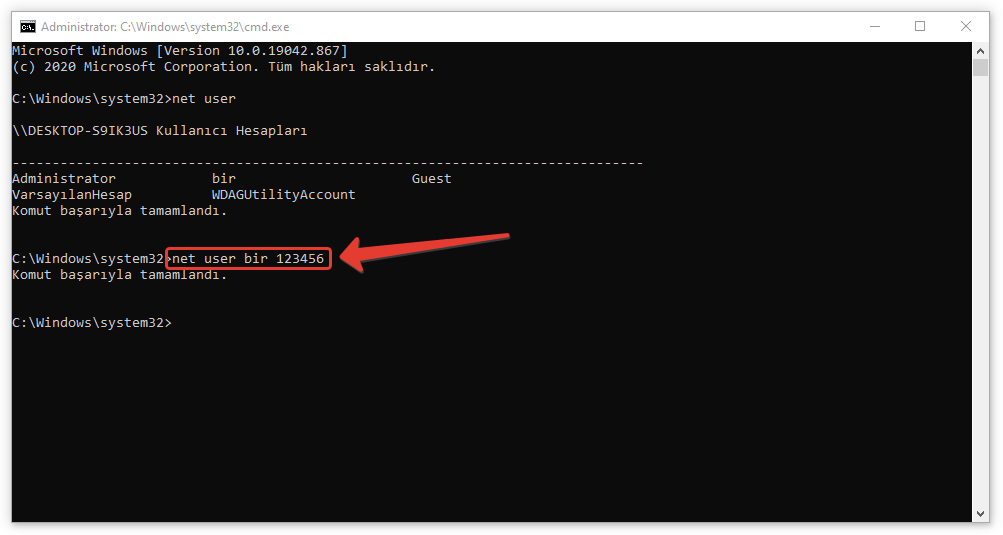 Parolasını değiştirmek istediğiniz kullanıcı adını not edin ve “net user kullaniciadi sifre” komutunu uygulayın.
