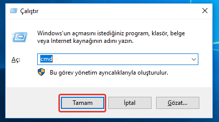 Şimdi bilgisayarımızın klavyesinden Windows + R tuşlarına basarak veya “Başlat” sekmesi üzerine sağ klikleyerek açılan pencerede “Çalıştır” diyoruz. Açılan küçük panele “cmd” yazıp enter yapıyoruz.