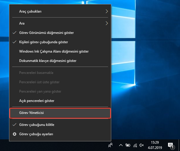 İlk olarak bilgisayarımızın görev çubuğu üzerine gelip sağ klikledikten sonra “Görev Yöneticisi” sekmesini seçiyoruz.