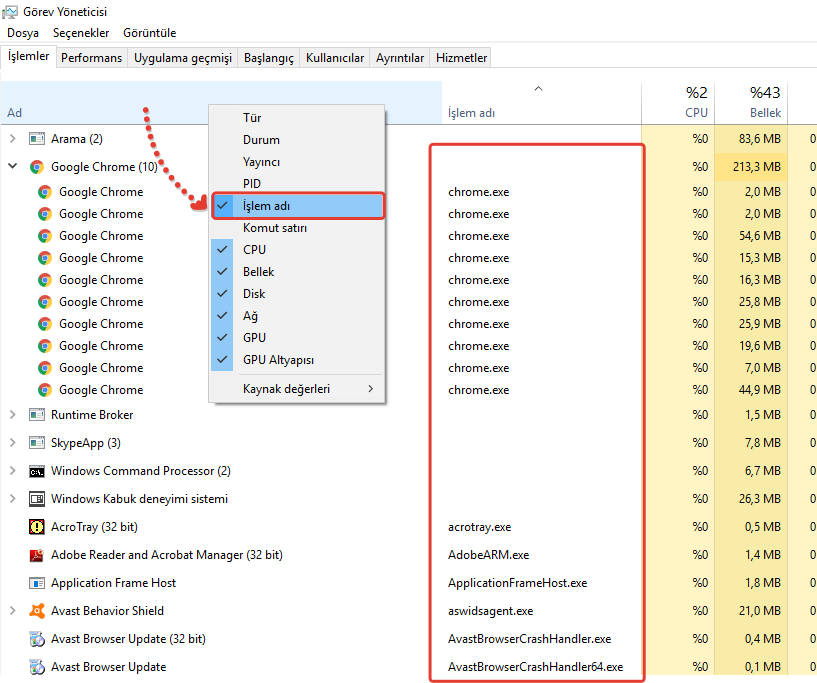 Gelen pencereden eğer çalışan uygulamalarda .exe ile biten işlem adları yoksa “Ad” kısmının üzerine sağ klikleyerek açılan panelden “işlem adı” yazan yeri seçiyoruz. Böylece çalışan uygulamaların işlem adları (Chrome.exe, OneDrive.exe vs. gibi) görünecektir. Hangi uygulamayı sonlandırmak istiyorsak o uygulamanın işlem adını öğreniyoruz.