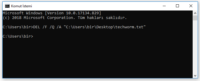 Örneğin; DEL /F /Q /A “C:\Users\bir\Desktop\techworm.txt”