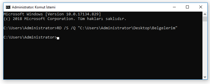 Örneğin; RD /S /Q “C:\Users\Administrator\Desktop\Belgelerim”