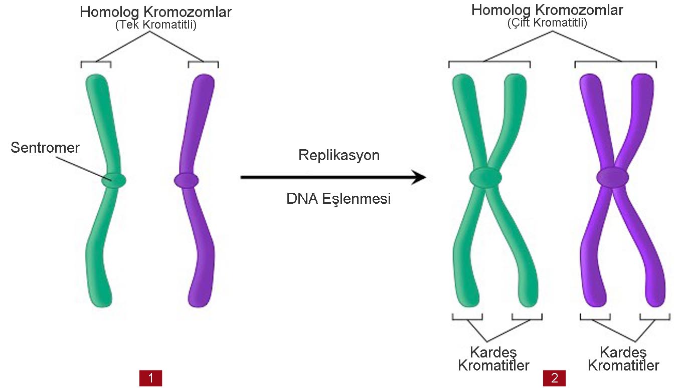 Bir numaralı şekilde bölünme sonrası meydana gelen tek kromatitli kromozomlar görülürken, iki numaralı şekilde ise bölünme öncesi (eşlenme sonrası) oluşmuş olan kromozomlar görülmektedir.