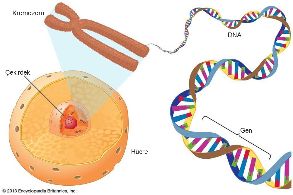Kromozom içindeki DNA işlevsel değildir. Zaten bölünme sonrası kromozom tekrar kromatin ipliğine dönüşür ve DNA’da tekrar işlevsel hale gelir. Üstteki resimde homolog kromozom kavramının geçtiğini görüyoruz. Homolog kromozom, biri anneden biri babadan gelen şekil ve büyüklük bakımından aynı, aynı karaktere etki eden kromozomlardır. Gen dizilişleri genelde farklı olabildiği gibi aynı da olabilir.