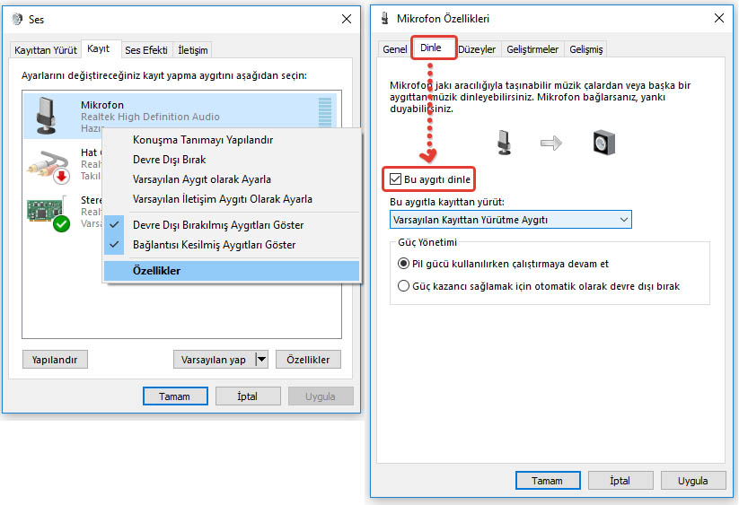 5- Son olarak ekstra bir bilgi vereyim. Diyelim ki siz hem mikrofondan kendi sesinizi ve bilgisayarınızdan çalan sesi kayıt etmek veya karşı tarafa göndermek/dinletmek istiyorsunuz. Bu durumda aşağıdaki gibi gösterdiğim adımları izleyebilirsiniz. Ancak bu kez sesinizin yankılanma sorunu ortaya çıkacaktır. Neyse uzatmadan yöntemi anlatayım. Kayıt kısmından Mikrofonun üzerini sağ klikleyerek “Özellikler” diyelim. Açılan pencereden “Dinle” kısmına gelerek “Bu Aygıtı Dinle” seçeneğini seçili hale getirip Uygula > Tamam diyelim. İşlemimiz tamamdır.