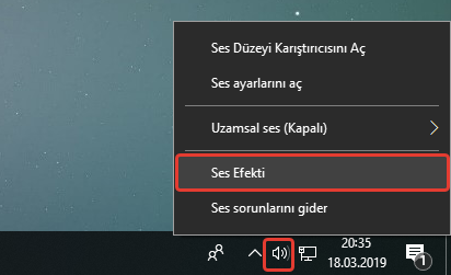 1- Öncelikle bilgisayarınızın masaüstünden “ses simgesini” sağ klikleyerek “ses efekti” sekmesini klikleyin.