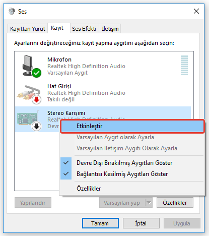2- Kayıt sekmesindeyken “fare ile boşlukta” sağ tuş tıklayarak “Devre Dışı Bırakılmış Aygıtları Göster” seçeneğini seçin. Bu esnada “Stereo Karışımı” isminde kayıt cihazını görmüş olmanız gerekir.